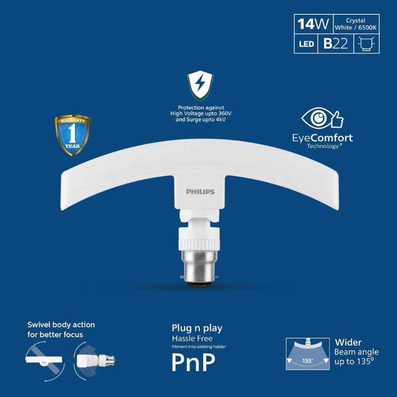 The Philips Stellar Bright Curvy LED T-Bulb delivers wider illumination with its unique curved head and swivel design, offering both vertical and horizontal adjustment for perfect light placement. With 1260 lumens of brightness and Eye Comfort Technology, this 14W T-bulb provides powerful yet gentle lighting for everyday use. Easy to install with a B22 plug-and-play base, it combines efficiency, flexibility, and modern design—ideal for any home.