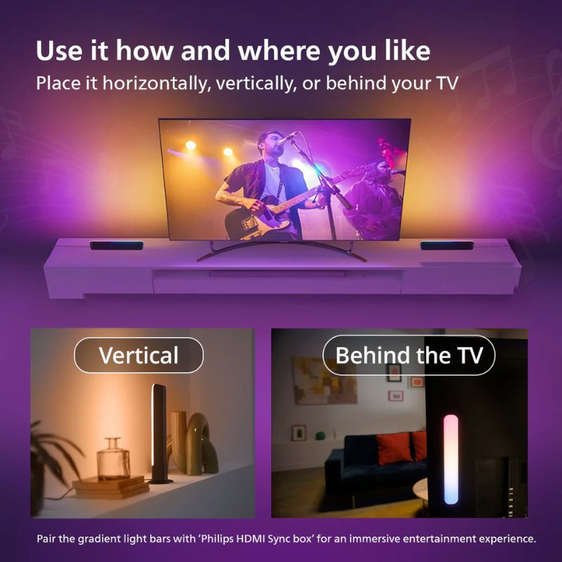 MULTIPLE WAYS TO INSTALL: Use the mounting brackets to set up behind the monitor, or stand them next to the TV – The light bars can also be placed horizontally without the mounting brackets